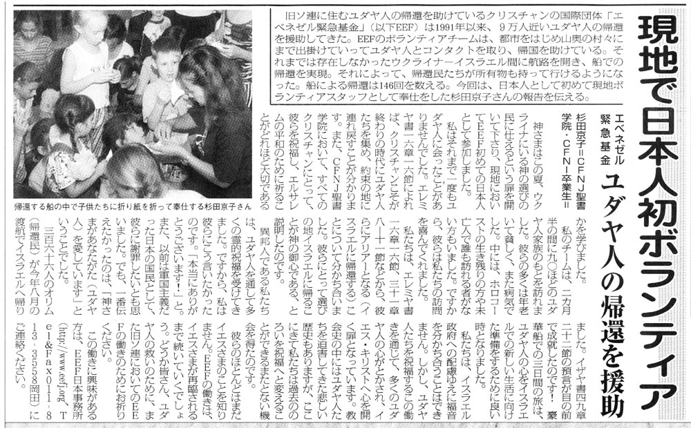 子供に折り紙を教える 証をする杉田京子 残念なことに、わたしたちはエベネゼルのポリシーとして、イエスさまのことや新約聖書については話すことができません。もしそれをすれば、この働きは政府によって閉ざされてしまうからです。でも、わたしたちは神様について、また旧約聖書については彼らに話します。そして、神様が、彼らの心を整えてくださって、故郷の地、イスラエルに着いたときに、イエスを救い主として受け入れることができるように、わたしたちはただ祈ります。