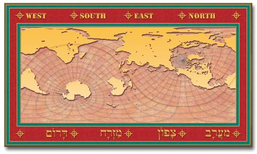 この地図はエルサレムを極として正距離円筒図法で展開されています。したがって普通の地図の上側全てが北であるように、上側全てがエルサレムなのです。エルサレムが地球上のもっとも重要な場所であり、全地の上に立つという主張がなされています。