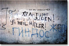 私達は歴史の1ページとしてナチス・ドイツによるユダヤ人大虐殺について知っています。これは20世紀最大の悲劇のひとつとして現在も記憶されています。そしてこのような悲惨な出来事は現代の社会においては再び起こりえないと考えます。 1938年7月6日から15日まで、米国大統領ルーズベルトの提案によりフランスのエヴィアンでエヴアン会議が開催されました。それは第三帝国を追われるユダヤ難民の受け入れをどのようにするかの国際会議で32カ国が参加しました。その席上でナチスドイツのヒトラーは世界の国々にユダヤ人を受け入れるようにチャレンジしました。しかし結果的にはほぼすべての国はユダヤ人の入国を拒否し、国境が閉ざされ、逃げ場を失ったユダヤ人達は結果的に大虐殺の被害者となりました。 当時の誰もあれほど悲惨な大虐殺が起こることを想像していませんでした。また、私達は「当時に戻ることができるならユダヤ人を助けたのに。ユダヤ人の血を流す仲間にならなかったのに。」と思います。 それにも関わらず、その反面「旧ソ連諸国の国境が閉ざされることは無い、ユダヤ人はいつでも出国できる」と考え、帰還に対して援助の手をこまねいています。 エレミヤ16章16節に漁師(クリスチャン)の後に狩人(迫害)が来るとはっきりと警告しています。 そして実際、反ユダヤ主義の気運は近年ますます高まっています。 「1938年当時ユダヤ人を助けなかった仲間にはならない。」と私達が言いながら現在彼らの出国に救いの手を伸ばさないなら、当時と同じ過ちを繰り返す事になります。 スターリンの時代にユダヤ人を含めて数千万人の人たちが虐殺されました。ユダヤ人が住んでいる北の国は血に塗られた場所なのです。 壁に書かれた反ユダヤ主義的な落書き |